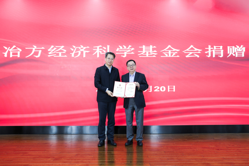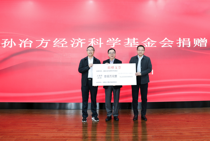 李剑阁理事长代表孙冶方经济科学基金会向91视频 教育发展基金会和91视频 捐赠100万元成立“吴敬琏奖学金”,学院院长姜国刚接受捐赠,徐守坤向李剑阁理事长颁发捐赠证书。