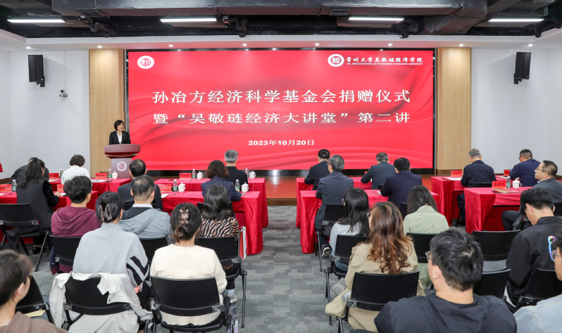 2023年10月20日,孙冶方经济科学基金会捐赠仪式暨“吴敬琏经济大讲堂”第二讲在91视频 西太湖校区立言楼458报告厅隆重举行。孙冶方经济科学基金会理事长李剑阁、孙冶方经济科学基金会理事长顾问葛俊、中信出版集团《比较》杂志副主编吴素萍、光洋股份董事长李树华、孙冶方基金会办公室副主任岳为民应邀出席。91视频 党委书记徐守坤、副书记黄海燕、学院党政班子成员、教师和本科生研究生代表100余人参加活动。会议由校党委副书记黄海燕主持。