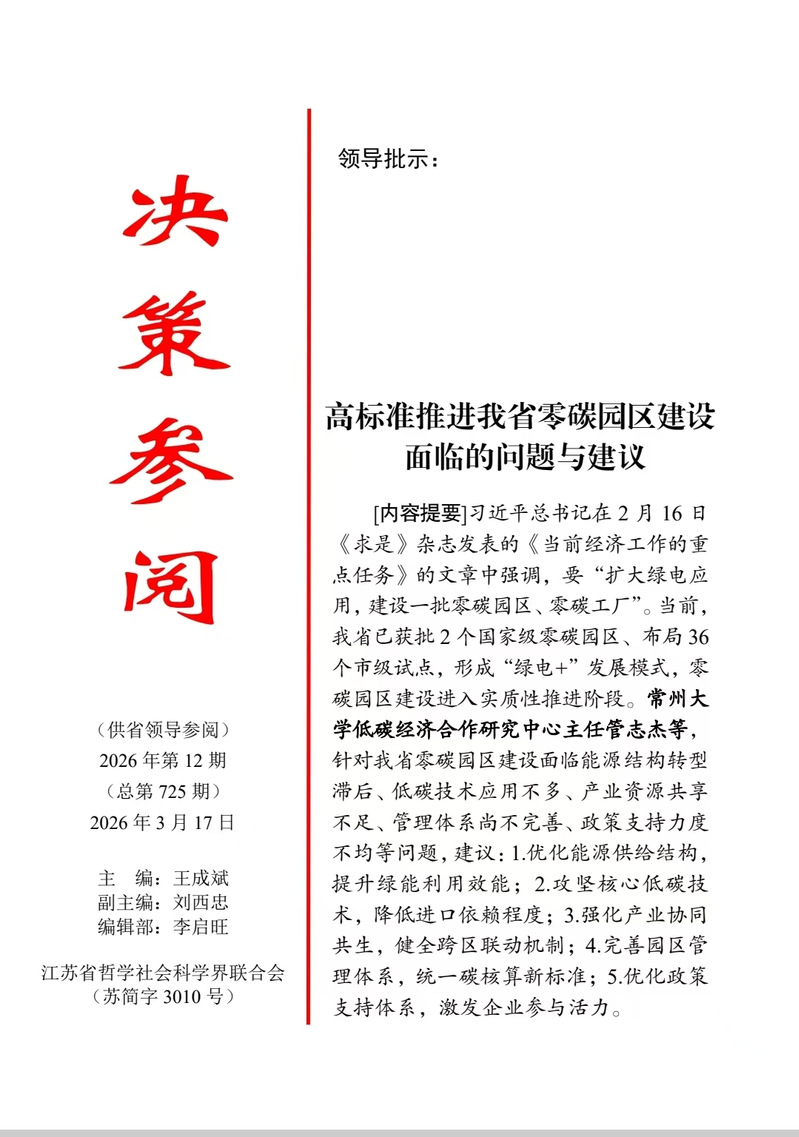 近日,91视频 管志杰教授与国贸242班王博涵撰写的决策咨询报告《高标准推进我省零碳园区建设面临的问题与建议》在江苏省哲学社会科学界联合会内刊《决策参阅》2026年第12期发表,并获江苏副省级领导肯定性批示。